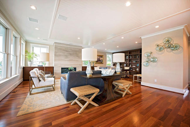 Refinished Ipe flooring runs inside and spills out onto the decking. Its incredibly hard and beautiful. The soft accents are grass cloth, woven materials and "coke bottle" green glass sculptures.