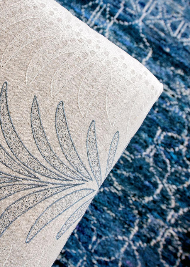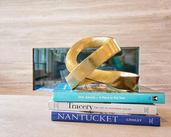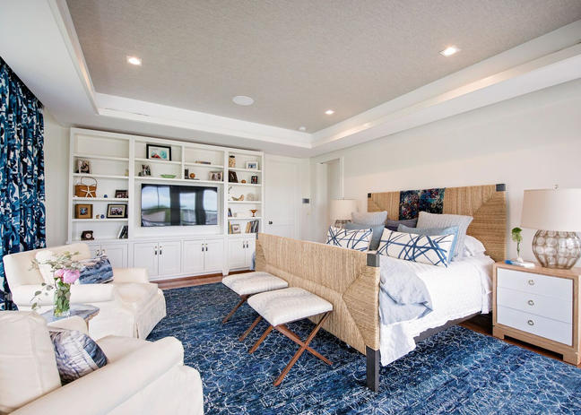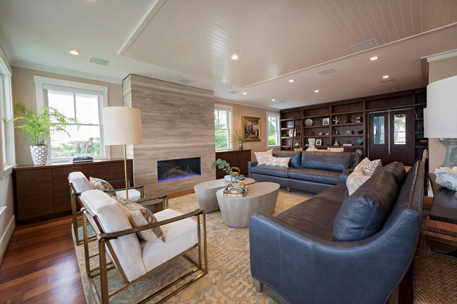 The custom walnut cabinetry, by Coastal Cabinets, is book matched and houses an elevator with a TV so the family can watch TV at the touch of a button without blocking the window on a daily basis. The rug from the Gallery of Oriental rugs is stunning and mimics the stone tops in the kitchen. The smokey grays, greens and creams create a soft unexpected palette at the beach. Think cloudy day on the marsh vs. your typical blues seen in coastal houses.