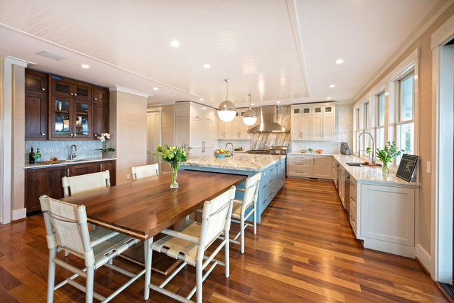 The family loves to cook and entertain. I must say, this may be the largest kitchen I have ever done. The work surfaces wow and the storage is so well-planned that a quick meal or a catered event can be easily executed. The custom walnut table is housed in the island to seat 5-6 on a daily basis. When the table is pulled out of the island, it seats 10. Designed by Jim Graham, at Kersting Architecture and created by Coastal Cabinets, beauty is in the details.