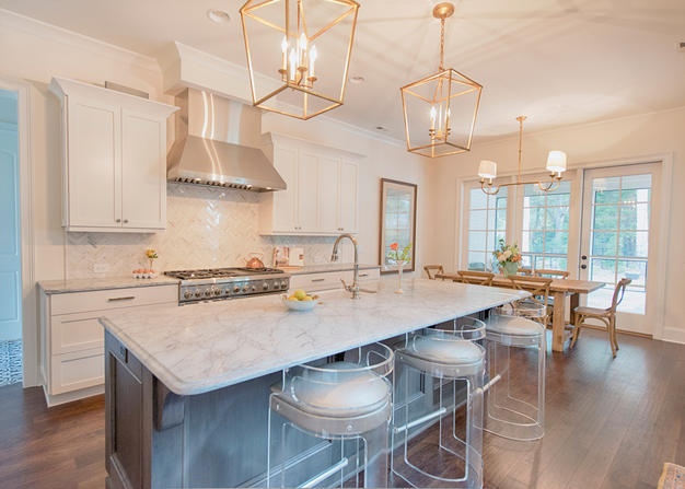 The overall vibe of the home is a touch modern with an old-school beach house influence. Old-fashioned polished nickel lighting over the island balances out the modern lines of the living space. The colors from the kitchen came from the natural stone of the splash and counters. Beauty meets function!