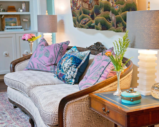The custom walnut cabinetry, by Coastal Cabinets, is book matched and houses an elevator with a TV so the family can watch TV at the touch of a button without blocking the window on a daily basis. The rug from the Gallery of Oriental rugs is stunning and mimics the stone tops in the kitchen. The smokey grays, greens and creams create a soft unexpected palette at the beach. Think cloudy day on the marsh vs. your typical blues seen in coastal houses.